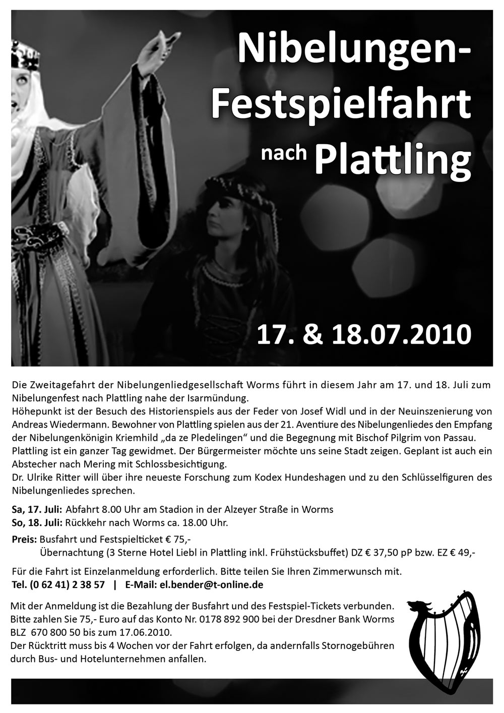 Die Zweitagefahrt der Nibelungenliedgesellschaft Worms führt in diesem Jahr zum Nibelungenfest nach Plattling nahe der Isarmündung. Höhepunkt ist der Besuch des Historienspiels aus der Feder von Josef Widl und in der Neuinszenierung von Andreas Wiedermann.