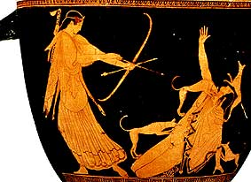 Am bekanntesten ist die Geschichte des Aktaion, der Artemis dummerweise nackt beim Baden sah und durch den Zorn der Göttin in einen Hirsch verwandelt wurde, daraufhin jagte Artemis den Hirsch Aktaion und tötete ihn mit einem Pfeilschuss.
