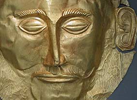 Mit dem nächsten Beispiel verlassen wir den Olymp und begeben uns nach Mykene. Diese Maske kennen viele unter Ihnen als die des Agamemnon (des Anführers der Griechen gegen Troja), ein gutes Jahrhundert nach Schliemann schreibt man sie heute aber zumindest seinem Vater Atreus zu, dessen Geschichte ich hier grob umreißen möchte: