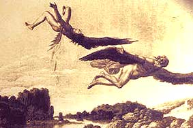 Daidalos fiel beim König in Ungnade und wurde eingesperrt, daraufhin konstruierte der Meisterschmied (ebenso wie später Wieland) Flügel aus Federn und Wachs, mit denen Vater und Sohn in die Freiheit flog. Ikaros aber stürzte ab, weil er der Sonne zu nah kam.