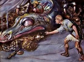 Doch am Ende dieser segensreichen Zeit bricht Unheil über das Land herein. Ein flüchtiger Sklave sucht in einer Höhle Zuflucht, in der ein Schatz verborgen ist. Diesen Schatz bewacht ein Feuer speiender Drache. Als der Sklave, während der Drache schläft, einen wertvollen Kelch stiehlt, mit dem er später Verzeihung für seine Flucht erkaufen will, fordert er die Rache des Monsters heraus. Diese Rache trifft die Göten, die in der Umgebung des Untieres leben.