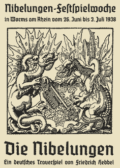 Im Jahre 1937 wurde die Idee zur Tat. Worms wurde die Ehre zuteil, Schlußstein der am 13. Juni 1937 begonnenen 4. Reichstheaterfestwoche zu sein. In Anwesenheit des Schirmherrn des deutschen Theaterwesens, des Reichsministers Dr. Goebbels, und des Reichsstatthalters in Hessen und Gauleiters Jakob Sprenger ging am 20. Juni vor zahlreichen führenden Persönlichkeiten von Stadt, Partei, Wehrmacht, Kunst und Theater die Hebbelsche Nibelungen-Trilogie in Szene. Der Gedanke, diese Festspiele zu einer dauernden Einrichtung zu machen, wurde allseitig begrüßt. So erleben wir dieses Jahr im Rahmen einer Nibelungen-Festspielwoche eine Wiederholung der Aufführung. Die Stätte der Aufführung, das jetzt 50jährige Spiel- und Festhaus der Stadt Worms, 1889 von Friedrich von Schön erbaut, liegt in nächster Nähe der geschichtlichen Stätte. Dort, wo jetzt noch die Türme des Domes den Fremden grüßen, stand einst auch die Königsburg der Nibelungen. Heute wuchert Gras über die Reste der alten Burg, und über den versunkenen Grundmauern wiegen sich die Wipfel altehrwürdiger Bäume. Wenn jetzt wieder die Hebbelschen „Nibelungen“ über die Bretter gehen an der Stätte, an der einst das älteste deutsche Königtum seinen Sitz hatte, dann wird das Theater wieder zu seinem ursprünglichsten Sinn zurückgeführt, Feierstätte des Volkes zu sein. Hier siegt wieder die Idee deutschen Volkstums. Auch wenn der Spielleiter vom Gesetz des Theaters her die Szene zum Menschlichen hin auflockern muß, wird die Aufführung nie den starken ideenmäßigen Gehalt der Trilogie verleugnen können. Für uns ist das Drama Hebbels das Drama der Zeitwende, in der das im Boden der Heimat verwurzelte Heidentum der Germanen mit dem aufstrebenden Christentum rang. Und Hagen ist uns nicht der absolute Bösewicht, zu dem unsere Schulweisheit den Tronjer stempelte, sondern die reinste Verkörperung germanischer Gefolgschaftstreue. Sein Kampf gegen Kriemhild ist ein Kampf um die Ehre seines Herrn. Und seine Auseinandersetzung mit Dietrich von Bern ist ein Ansturm des naturverbundenen germanischen Heidentums gegen das im Jenseits verankerte Christentum. So greift das Festspiel von den Nibelungen Probleme unserer Zeit auf. So wird für uns die dramatische Ballade Hebbels zum weltgeschichtlichen Drama, aufgezeichnet auf dem Untergrunde rheinhessischer Landschaft und lebensnah gestaltet durch die Wucht des Wortes und der geballten Gebärde. Der Mythos der Sage verblaßt, und herauf steigt das Drama deutscher Geschichte, dessen handelnde Personen Menschen mit Fleisch und Blut sind.