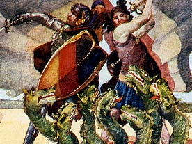 wütenden Hörner der Nibelungen heulen grässlich in den Streit, und