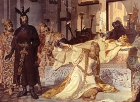 Kriemhild an Siegfrieds Bahre, Gemälde v. E. Lauffer, 1879 .