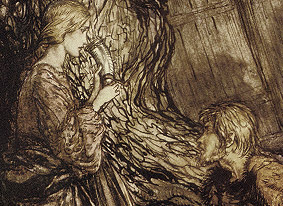 Als die Handlung der "Walküre" einsetzt, kommt Siegmund auf der Flucht vor Feinden in das Haus, das Sieglinde mit ihrem Mann Hunding bewohnt. Bereits als Kind wurde sie geraubt und später zur Ehe mit Hunding gezwungen. Die Geschwister erkennen sich nicht. Siegmund bricht zusammen und Sieglinde fragt sich was ihm fehlt; "Müde liegt er, von Weges Mühn: - schwanden die Sinne ihm? Wäre er siech? – " Sieglinde kennt nur starke Männer und das heißt zugleich: brutale und grausame Männer. Vor ihnen hat sie sich längst verschlossen. Siegmunds Schwäche weckt in ihr nie gekannte Gefühle. Doch bereits bei der Antwort auf seine Frage wo er denn sei, kehrt ihre Starre wieder zurück: "Dies Haus und das Weib sind Hundings Eigen." Als Siegfried seine Wunden erwähnt, wird sie wieder zugänglicher. Sie möchte sie sehen, doch Siegmund springt auf: "Gering sind sie, der Rede nicht wert; noch fügen des Leibes Glieder sich fest." Als Siegmund sich nochmals aufrafft und gehen will, ruft im Sieglinde energisch zu: "So bleibe hier!" "In heftigem Selbstvergessen", sagt die Regieanweisung, ruft sie ihm das nach. Was sie hier vergisst, sind die moralischen Zwänge, denen sie unterliegt. Sie ist verheiratet, wenn auch nicht freiwillig, aber Recht muss Recht bleiben und sei es nur das Recht des Stärkeren. Es ist nicht Mitleid mit dem Verletzten, das sie die Initiative ergreifen lässt, sondern die Hoffnung, die Hoffnung auf Liebe. Als Hunding erscheint, erkennt er sofort die Situation, er sieht die Ähnlichkeit zwischen den Geschwistern und spürt die Feindschaft zwischen ihm und Siegmund. Er scheucht seine Ehefrau herum und droht dem Fremden. Daraufhin widerspricht Sieglinde zum ersten Mal ihrem Mann: "Feige nur fürchten den, der waffenlos einsam fährt!" Sie lässt auch gleich ihren Worten Taten folgen und verabreicht Hunding ein Schlafmittel. Wieder ergreift sie die Initiative. Sie weist Siegmund auf das Schwert hin, das Wotan bei ihrer Hochzeit mit Hunding in den Stamm gerammt hat, in sorgsamer Vorbereitung der kommenden Ereignisse. Nur Siegmund kann es herausziehen, wobei es hier nicht um die körperliche Kraft geht, sondern um die Legitimation. "Eine Waffe laß mich dir weisen - : O wenn du sie gewännst! Den hehrsten Helden dürft ich dich heißen: dem Stärksten allein ward sie bestimmt." Sie macht ihm ein Versprechen: "fänd ich den heiligen Freund, umfing' den Helden mein Arm!" Wieder ist sie es, die den aktiven Part spielt. Sie geht weit hinaus über die Konventionen und erschrickt als die Tür aufspringt und den Blick nach draußen freigibt und das Paar "so sich plötzlich in aller Deutlichkeit wahrnehmen kann", vor dem Ausmaß ihrer Tat. Doch die Tür ist geöffnet, die Enge des Raums der Konvention gesprengt, und Siegmunds Liebeslied bestimmt noch einmal den neuen Charakter, den diese Liebe annimmt. Von "zarter Waffen Zier" ist die Rede, mit der der "Lenz" die Welt bezwingt, dieser "starken Wehr" mussten "Winter und Sturm weichen". Mit Siegmunds Liebeslied "Winterstürme wichen dem Wonnemond" das gelegentlich auch als einzige Arie im "Ring" bezeichnet wird, öffnet sich plötzlich eine neue Welt, was sich schon im Vorspiel zum Gesang ankündigt. "Eine nie gehörte Dimension von Wohlklang, weil ihm auch der Stachel des Schmerzes eingefügt ist." (Schickling, S.251). Nur einmal noch erklingt das Motiv in der Walküre, wenn vom Ungehorsam gegenüber der göttlichen Vorschrift die Rede ist. Der folgende Dialog ist angefüllt mit Bezügen zu anderen Stellen des "Rings". Sogar das Motiv des Liebestods taucht schon auf, wenn Siegmund singt: "Heiligste Minne höchste Not, sehnender Liebe sehrende Not brennt mir hell in der Brust, drängt zu Tat und Tod!" Sieglinde und Siegmund sind aber ein anderes Paar als Brünnhilde und Siegfried, sie haben ihre halb göttliche Herkunft abgelegt und sind nur noch Kinder einer menschlichen Mutter und sie sind Mann und Frau, indem sie einander Bruder und Schwester sind. " Bist du Siegmund, den ich hier sehe – Sieglinde bin ich, die dich ersehnt: die eigene Schwester gewannst du zueins mit dem Schwert!" Siegmund antwortet: "Braut und Schwester bist du dem Bruder – so blühe denn Wälsungen-Blut!" "Er zieht sie mit wütender Glut an sich; sie sinkt mit einem Schrei an seine Brust. – Der Vorhang fällt schnell", so die Regieanweisung Ende des ersten Aufzugs.